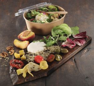 fresh salad, burrata, peach compote, cherry tomatoes, quinoa, artichokes, walnuts, dried tomatoes, olives, aceto balsamico, salt