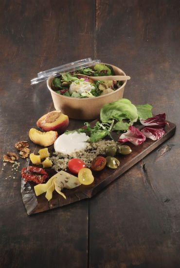 fresh salad (iceberg, radicchio), turkey meat 18%, fava beans, carrot, wholegrain rice, bulgur, quinoa, olive oil, sunflower oil, broccoli and cabbage sprouts, pumpkin seeds, lemon juice, salt, spices